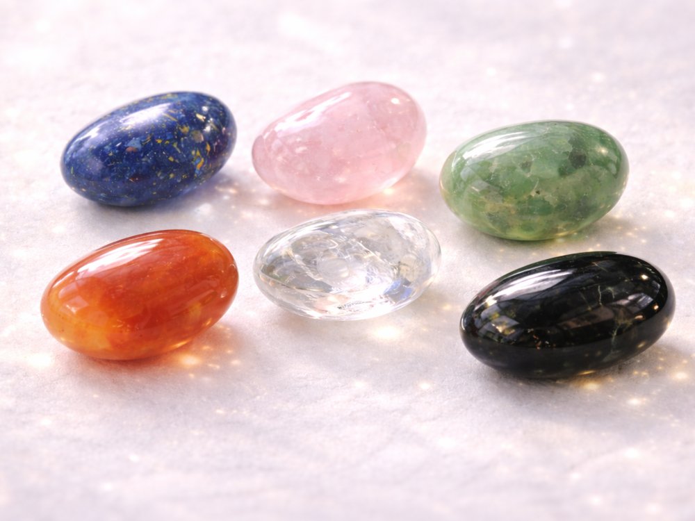 ラピスラズリ、ローズクオーツ、水晶、翡翠、オニキス、アクアマリンです。